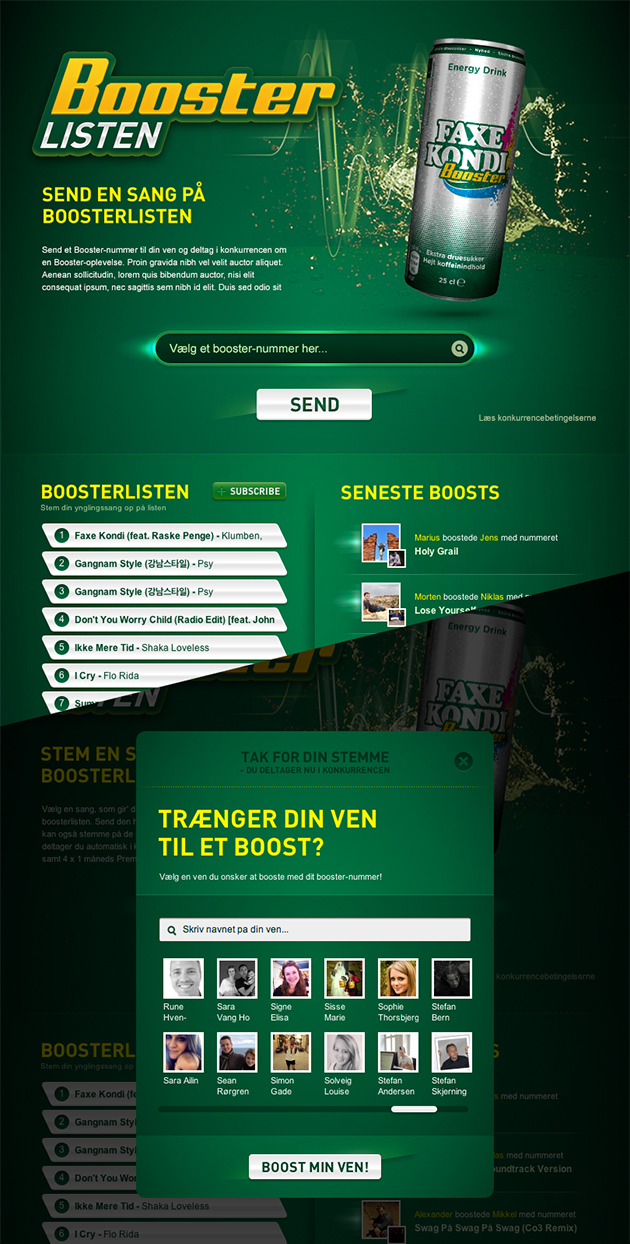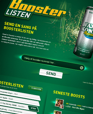 The application was designed as a part of Faxe Kondi's launch of their energy drink called Booster. The application let's people select a song to boost their friends with. The list of songs are compiled by the number of times a song has been used to boost a friend with. A Spotify playlist of the top tracks can be subscribed to from the app.
